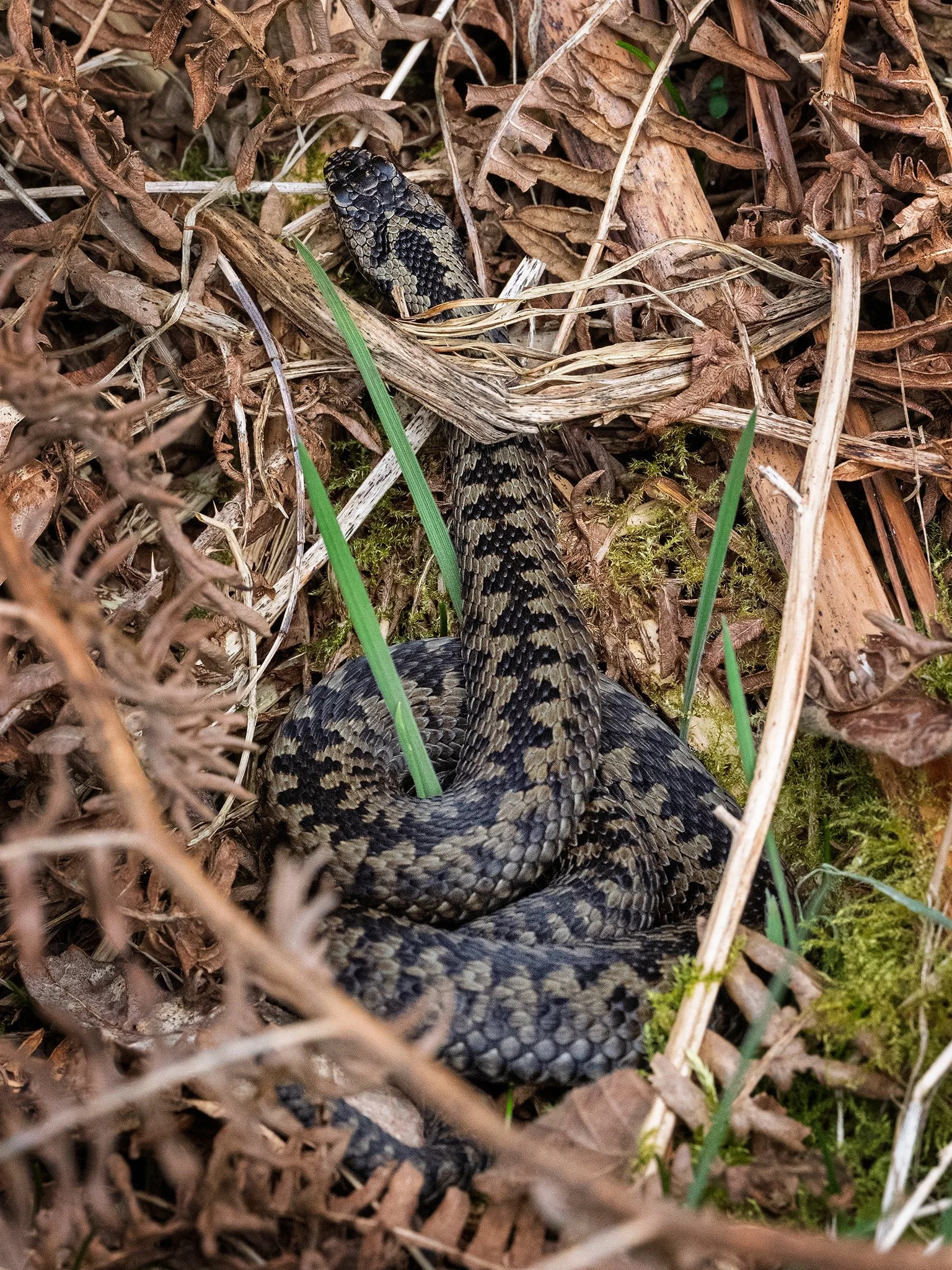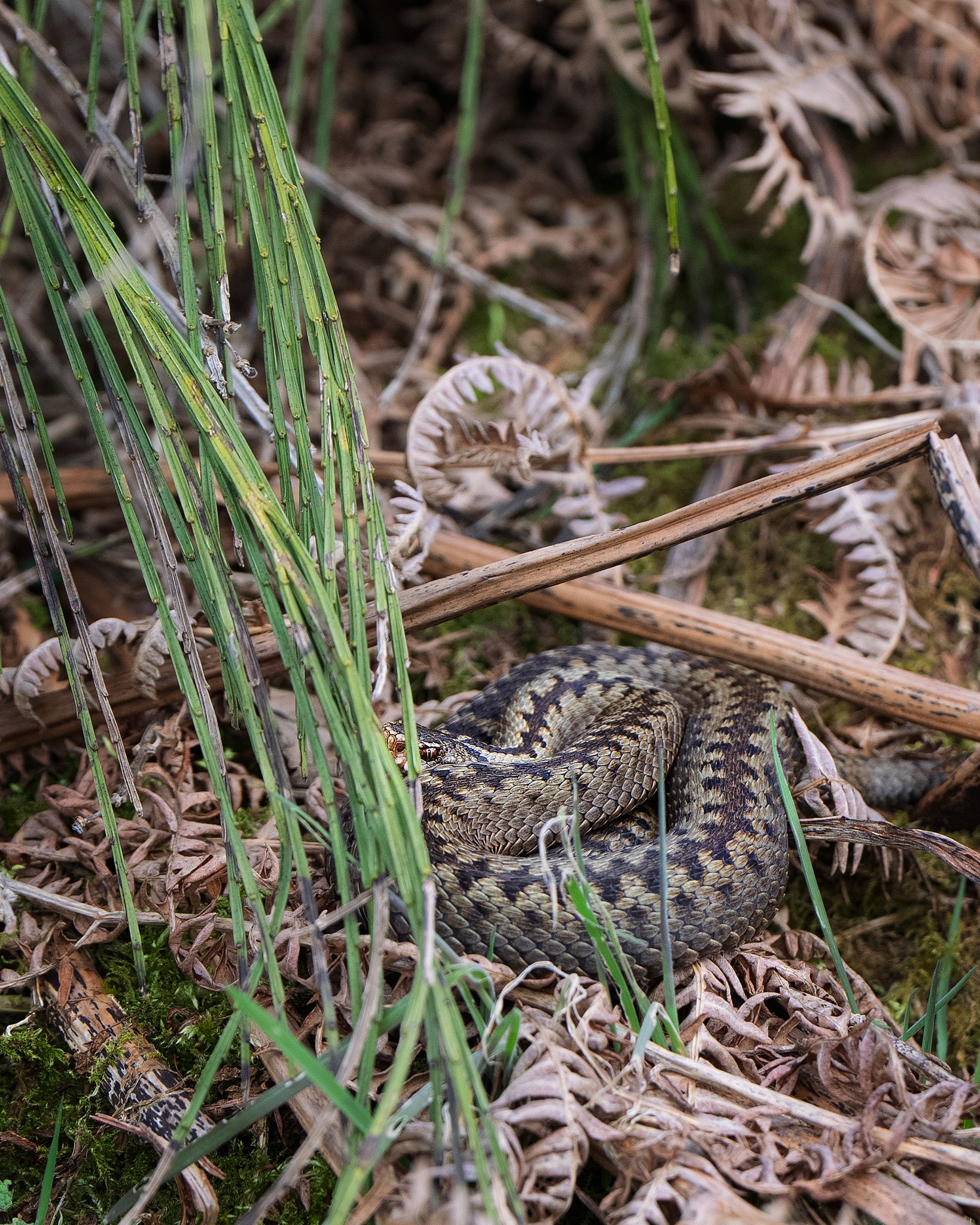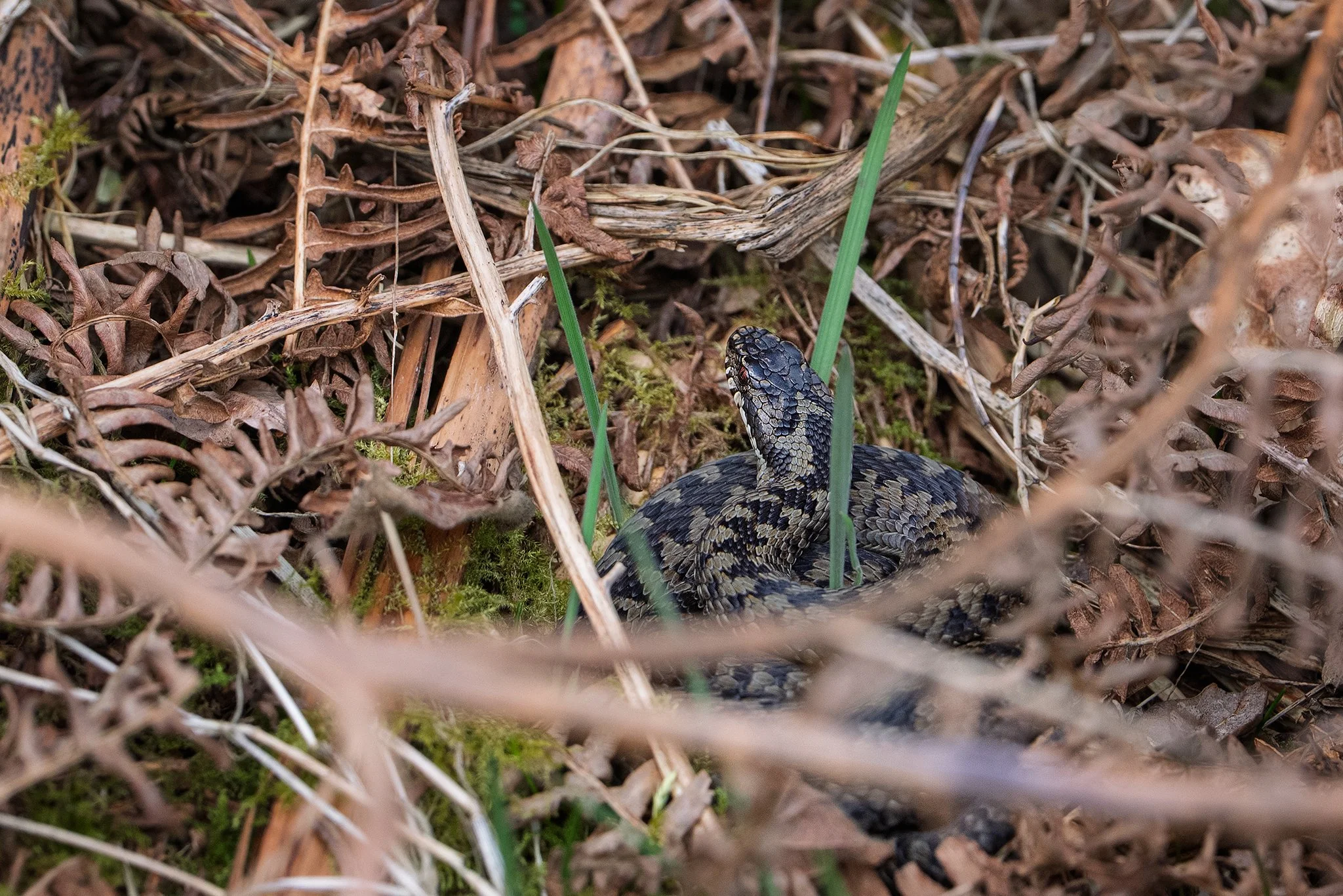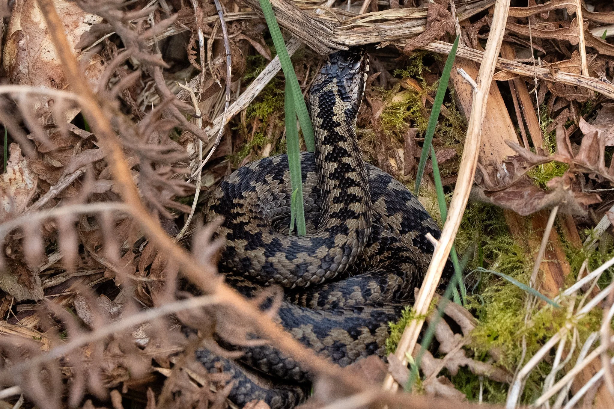 After months below ground, adders emerge to bask, taking advantage of low, gentle sunlight. Vegetation is still sparse, making them easier — though never easy — to see.